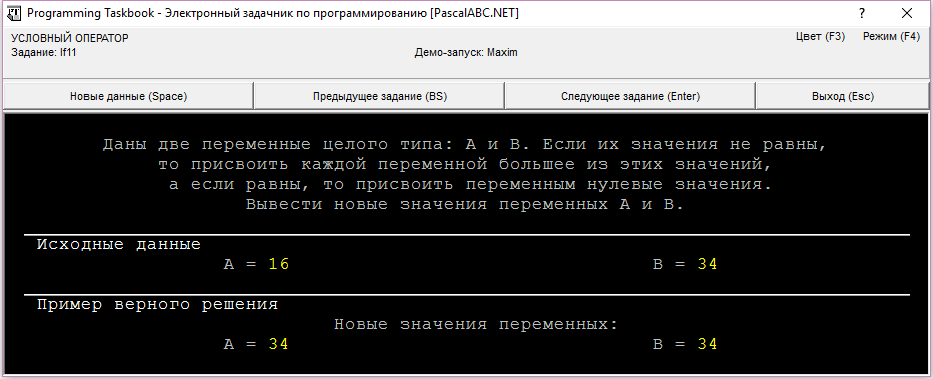 Даны две переменные целого типа: A и B. Если их значения не равны, то присвоить каждой переменной большее из этих значений, а если равны, то присвоить переменным нулевые значения. Вывести новые значения переменных A и B.