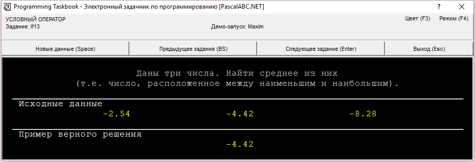 Даны три числа. Найти среднее из них (т. е. число, расположенное между наименьшим и наибольшим).