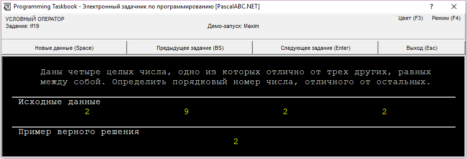 Даны четыре целых числа, одно из которых отлично от трех других, равных между собой. Определить порядковый номер числа, отличного от остальных.