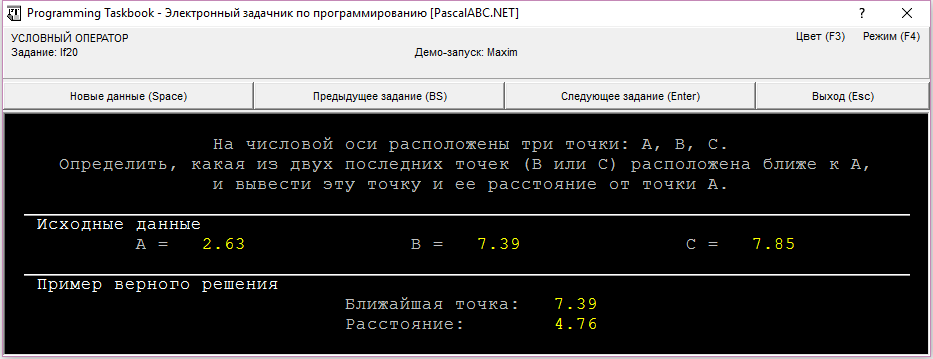 На числовой оси расположены три точки: A, B, C. Определить, какая из двух последних точек (B или C) расположена ближе к A, и вывести эту точку и ее расстояние от точки A.