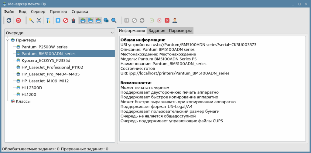 Чтобы добавить принтер, после установки драйвера, в Astra Linux надо запустить графическую утилиту fly-admin-printer. Расположена она в Главное меню → Параметры системы → Оборудование → Принтеры.