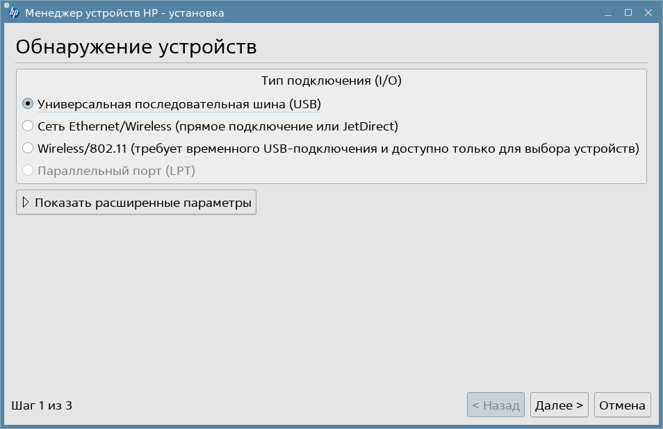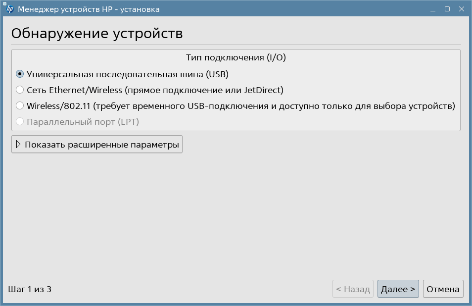 sudo hp-setupBashМастер имеет графический интерфейс, в котором необходимо выбрать нужные опции подключения.