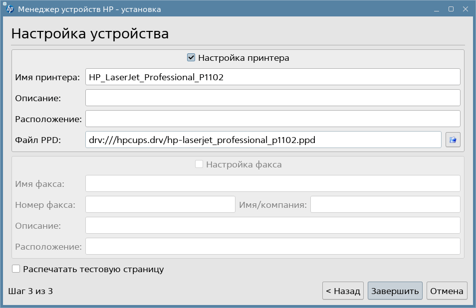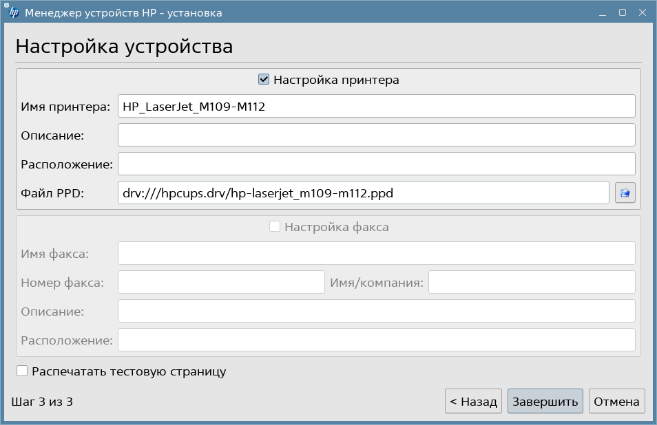 Мастер автоматически добавит принтер в систему, он отобразится в менеджере печати, а так же распечатает тестовую страницу.