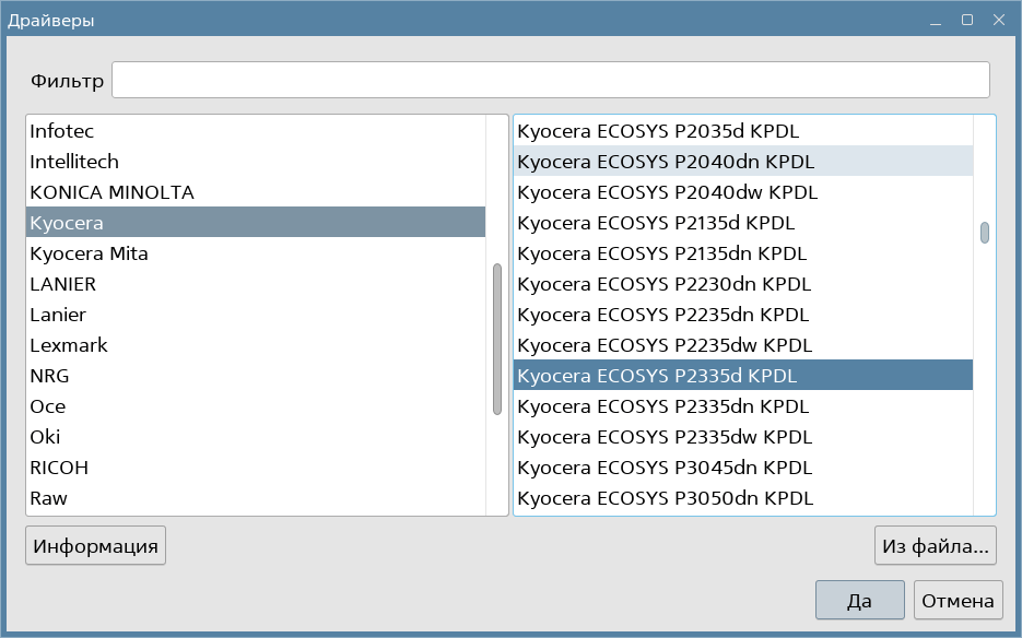 sudo apt install ./Debian/Global/kyodialog_amd64/kyodialog_9.4-0_amd64.debBashПосле установки пакета с драйверами, в мастере fly-admin-printer автоматически не определился сам драйвер, по этому пришлось выбрать его вручную. Возможно после перезагрузки системы, все бы определилось автоматически.